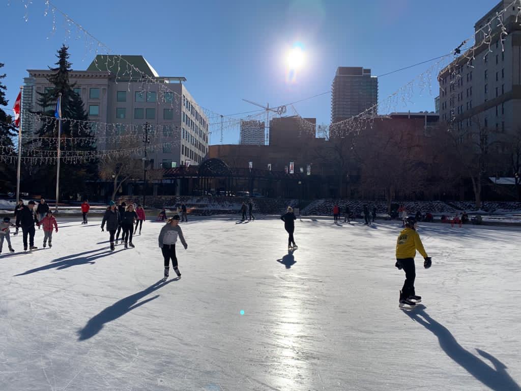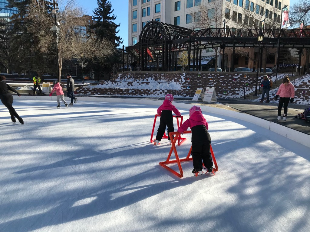 Recently we met up with some friends at the Olympic Plaza in downtown Calgary for an afternoon of ice skating. Every year they flood the area to make an outdoor rink for the public to enjoy for free. It’s a great spot, surrounded by the big city buildings and the Calgary Tower looming overhead. There is plenty of parking nearby and the CTrain also stops one street down, so it’s very easy to get there.
